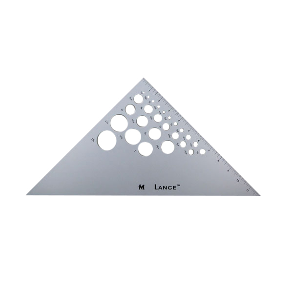 Gabarito em alumínio de 12” com 45° / 90° graus, com vários diâmetros entre 1/16″ a 1 3/8″ de circulos.
